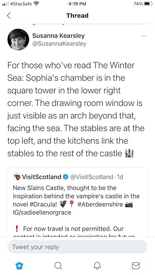 An overhead view of Slains Castle, which is also said to be the inspiration for Bram Stoker’s setting in Count Dracula. In a tweet Kearsley explains where the main rooms mentioned in The Winter’s Sea could be found.