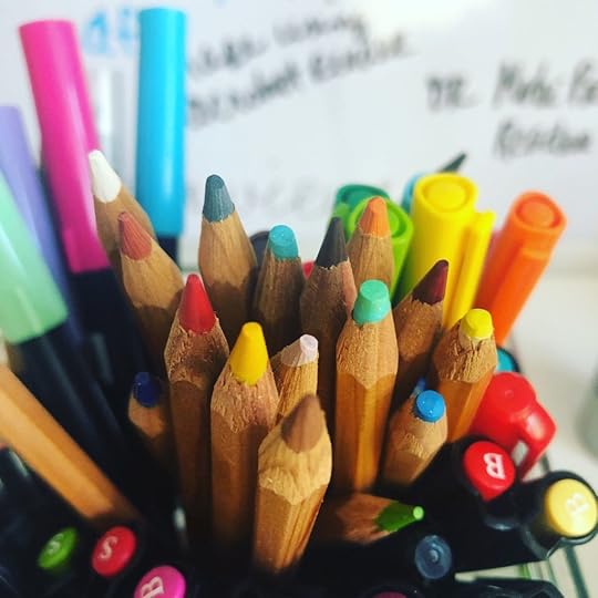 But I’m trying to spend less time on social media and more time fostering creativity. Doodling is one of my favourite things. And watercolours are my new favourite medium despite having a lot to learn. Doodling and playing with colour helps settle my mind. Then I generally take care of marketing and promotion duties. I write for an hour. Then I write again in the afternoon. So, the opposite of what science suggests.