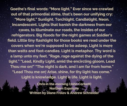 Who remembers the TV show Northern Exposure? I loved that show! John Corbett played the role of Chris Stevens, a radio host who quoted Walt Whitman, Jung and Dostoevsky and provided an offbeat philosophy and commentary on the goings-on in Cicely, Alaska. One of his memorable rambles was about finding the light.