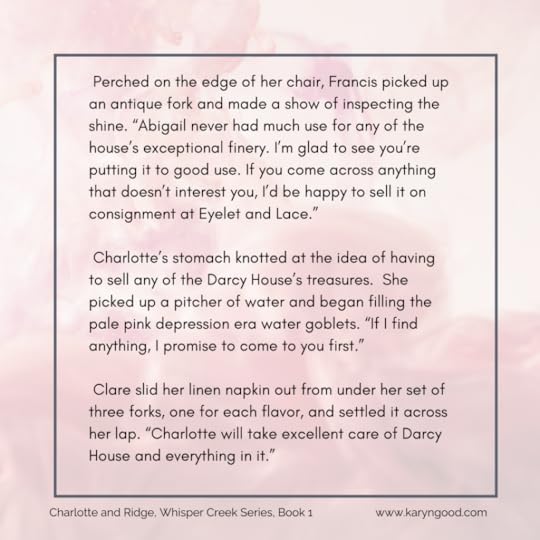 Since I mentioned it, I thought I’d share the following is a snippet. Charlotte is hosting a cake tasting for Clare Balkwell and Francis Fisher, co-chairs of the local women’s aid group who are planning an anniversary party for their church.
