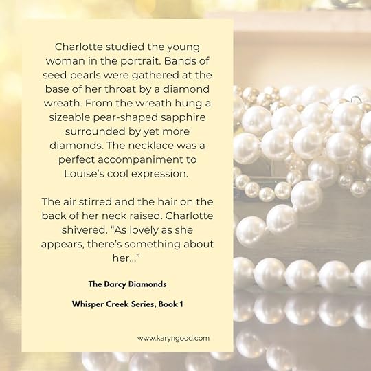 I’m going to leave you with another sneak peek at the first book in my Whisper Creek series. Charlotte has moved into her family home and has plans to turn it into a bed and breakfast. Four generations have lived in Darcy House, which was built by Albert and Louise Darcy in 1907. Rumours also swirl around The Darcy Diamonds. Jewelry given to Darcy brides on their wedding day and on the birth of children.