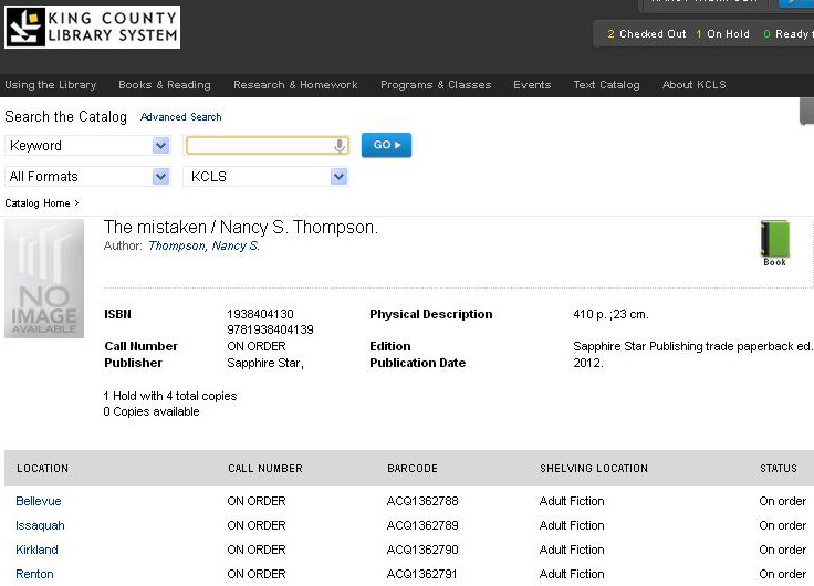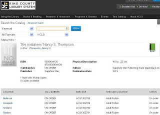 But still, I cannot tell you how excited I am by this, because the KCLS doesn't ordinarily stock titles that have not been reviewed by Kirkus, the NY Times, or the Library Journal, yet there it is, on order and soon to be stocked on the shelves of Washington's most popular library system.