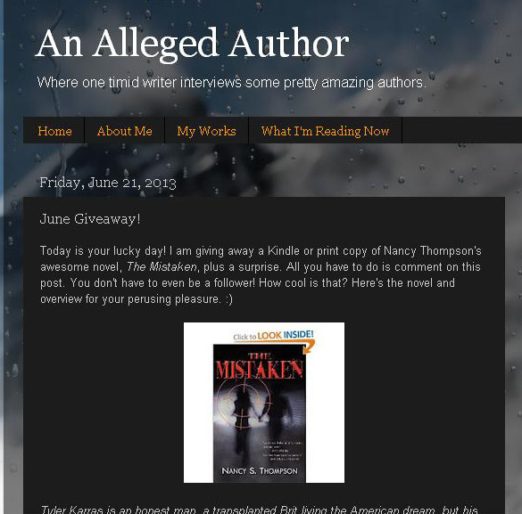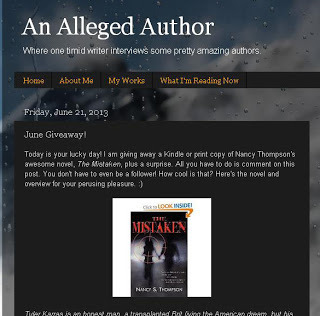 Just hop on over to her blog and comment on this post andyou will automatically be entered to win a FREEPRINT or Ebook copy ofThe Mistaken!