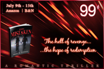 Starting NOW, I'm running a week-long special promotion. The ebook version of my debut romantic thriller, The Mistaken, will be on sale for 99 cents on Amazon and Barnes & Noble!