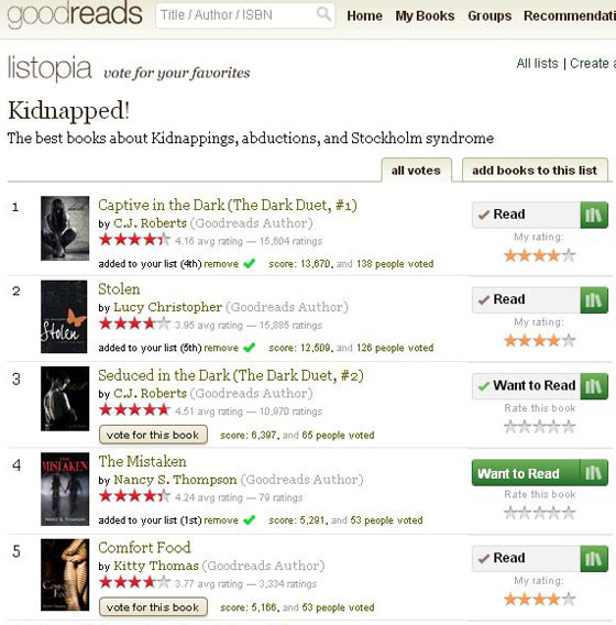 Not only is The Mistaken still loitering in Amazon’s Top Rated in Romantic Suspense, it’s also ranked fourth on Goodreads’ Kidnapped list, along with CJ Roberts’ Dark Duet Series and Lucy Christopher’s Stolen, all of which I enjoyed.