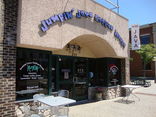 I decided to spend this fine Monday morning at Jumpin' Java Coffee House, one of Olga's favorite hot spots off Washington Street in her small hometown of Grand Haven, Michigan. I'm sitting at a table by the front window to keep an eye out for her. Ah, here she is, sporting Capri jeans and a red Wonder Woman t-shirt, her red curly hair done in french braid pigtails.