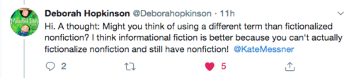This led to an interesting conversation amongst several folks over what the best term might be for a book that, “has some documentable information but also some made up parts–invented dialog, animal narrators, fantasy elements, etc.” (according to Melissa Stewart’s definition). So, for the first time ever, we’re switching the title of this particular list from “Fictionalized Nonfiction” to “Informational...