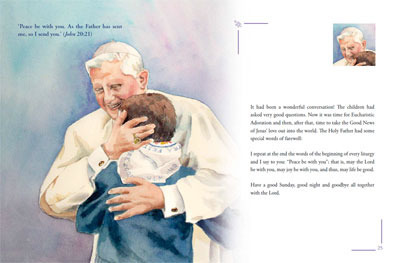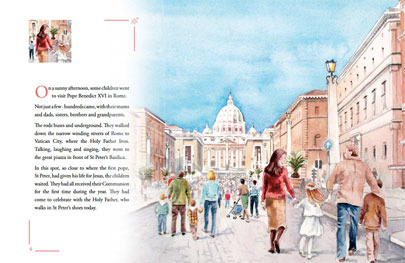 I was inspired to illustrate the book after I had read in my local Catholic newspaper that Pope Benedict was going to meet and have a conversation with Roman children who had recently received their First Holy Communion. This was during the Year of the Eucharist in the first months after his election.