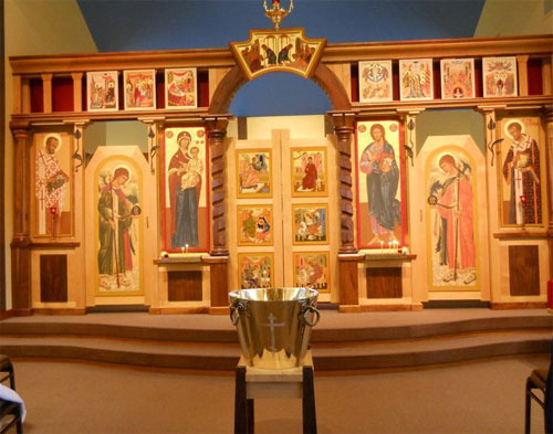 Of course, I'm taking a little bit of liberty with the title of this post, as the water had not yet been blessed by Father Janowicz. Here is the basin before the iconostasis: