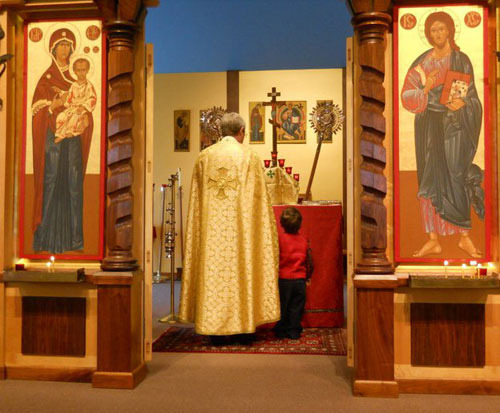 Following the reception of the three sacraments, the newly baptized is taken by the priest through the Royal Doors, into the sanctuary and before the altar, a powerful representation of entrance into full communion with God, the Giver of live and Lover of mankind: