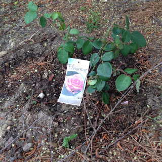 My rose from the Antique Rose Emporium arrived yesterday. I passed on the one that smelled like pineapples in favor of an old-time musky scent. My new rose is called The Beverly. I just planted Bev in the back yard along with a huge gulp of water and some of my famous rose food. All she needs is some sunlight and she'll hopefully spread her toes in the sandy soil of North Carolina and take off.