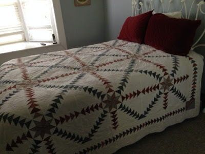 The slow way involved cutting out each individual triangle or square from a template and pinning it to the next piece to make a block, which then was joined to another similar block. Borders were added and then it was all pinned together and the three layers were painstakingly quilted by hand. Believe me, punching a needle through three layers of fabric and batting was not for the faint of heart and it was a source of pride when you could get your quilting stitch fine and consistent enough to reach 10 or 12 stitches to the inch. The quilt shown here was laboriously hand sewn and hand quilted while I was racing around the country years ago. While my friend took over the driving, I stitched the little triangles together in my lap. The pattern was appropriately called the Wild Goose Chase.