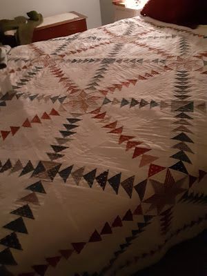 Meanwhile, here's a picture of the last quilt I made, before my eyesight started to go. The pattern is called the Wild Goose Chase, appropriately enough, since I pieced it together during my travels from one side of the country to the other, finally finishing it when I returned to the east coast. I used at least eight different blue fabrics and six or seven red ones, but with one common theme. They all had to contain stars. The center pinwheel in each block is composed of red and blue striped fabric. Maybe this is what led me to my obsession to write American historicals?
