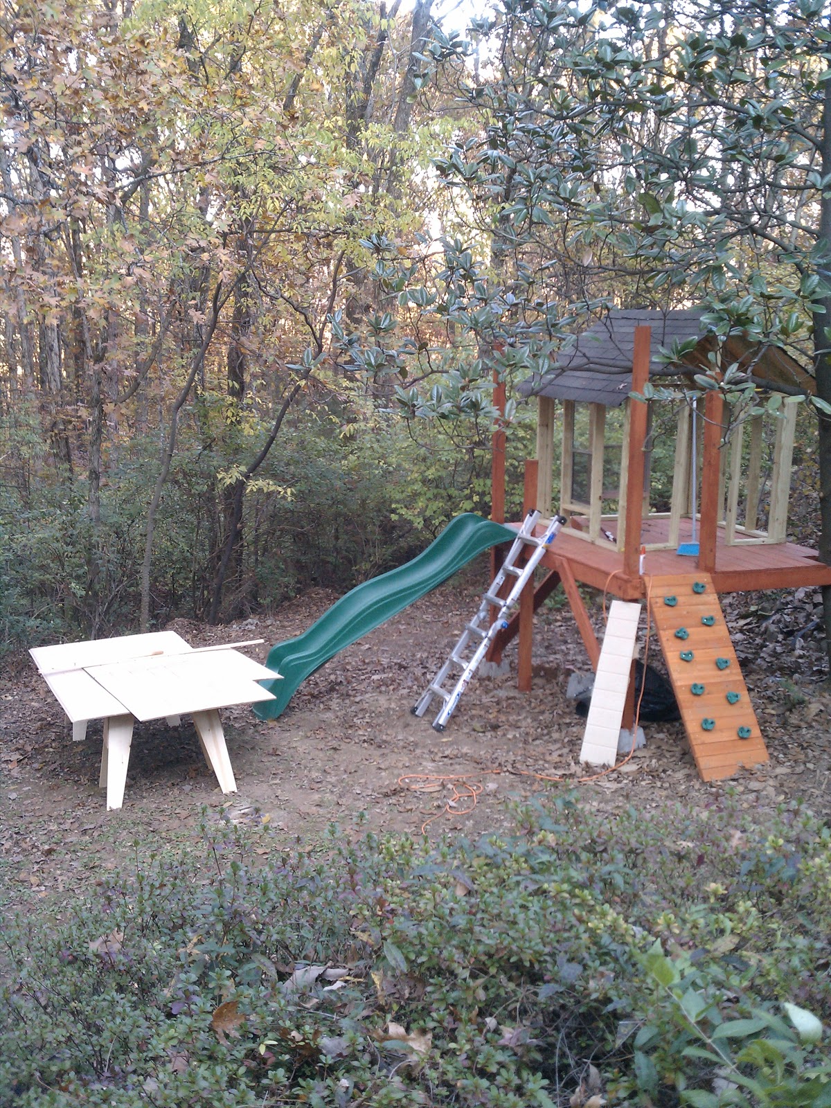 Tree house II is taking its toll. It's got a roof with shingles. Now we're doing the walls. We cutting out the siding and painting it before it goes up. (I know. It sounds backasswards, but it's working for us.) In the meantime our only child is mentally designing her girl cave. (Her: "Mommy, it shall have a small round table. Four chairs. A hammock. A toy box. Posters on the wall." Me: "Cressy, it's only four feet by four feet." Her: "It will fit, Mommy. Trust me." Me: "Sure, baby.")