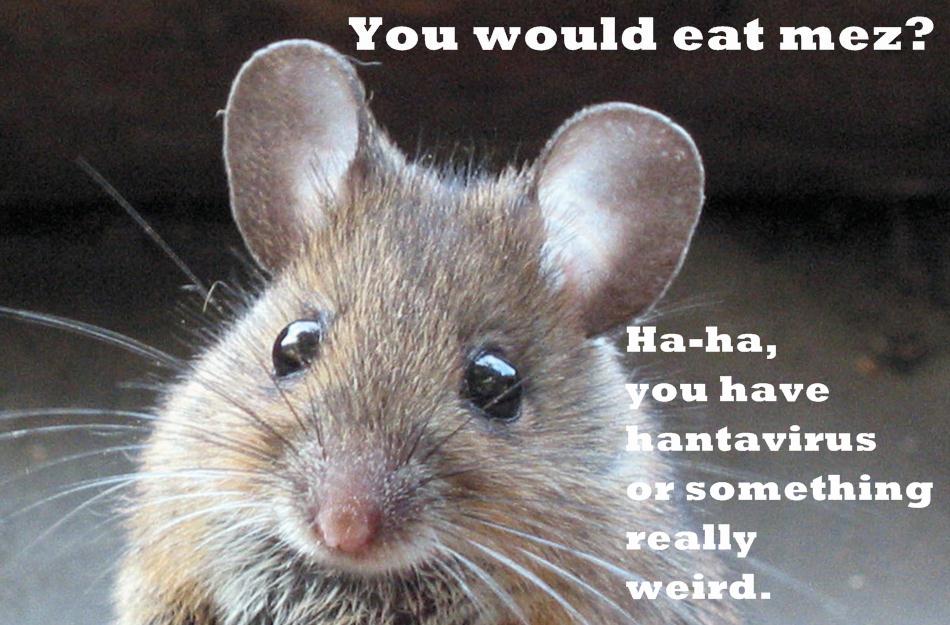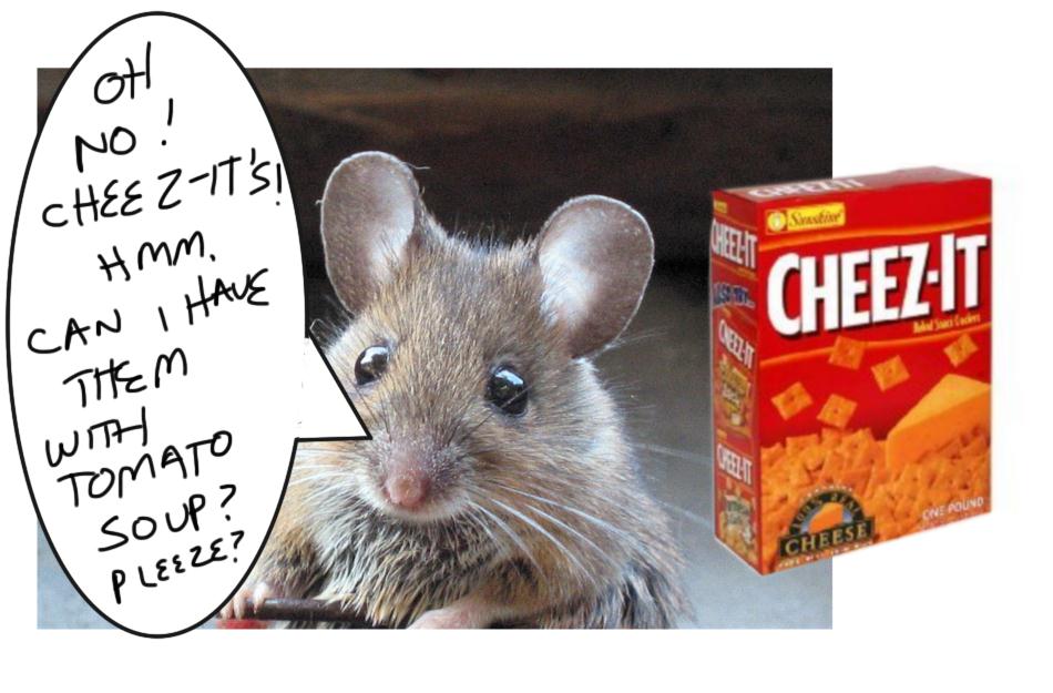 The cat was pissed. The kid doesn't want to go into the kitchen anymore. (She said something about rabies, which really impressed me because I thought at first she was talking about a hantavirus.) The Cheezit box didn't care one way or the other. I'm afraid for my toes. (I have a mental image of washing dishes at the sink while a mouse tries to nibble on said digits.) HIM was relieved he didn't have to dispose of a little rodent body. (Try to picture a burial at sea, except not at sea, and in a bathroom with a toilet already flushing. Sailors everywhere are shuddering.)