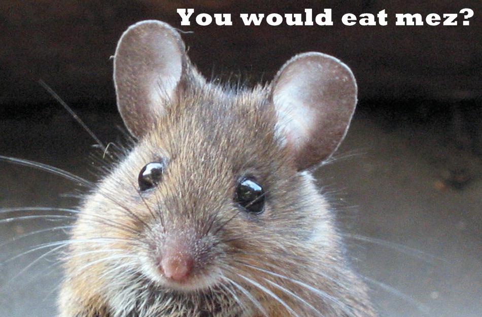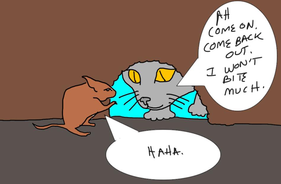 Well, he exploded into the room and I looked over to see him go into the kitchen and put something down by his food bowl. I thought, "My goodness, he found a cockroach." Then I reconsidered when the thing started to run toward me. It was somewhat larger than the average cockroach. (Although I have seen some pretty large cockroaches.) "My goodness," I thought, "FUCKING MOUSE!"