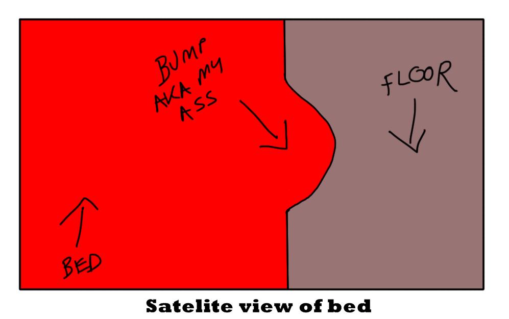 I know I misspelled a word. Maybe more. Oh, the hell with it.Anyhoo, there I was, sleeping with my tuckus hanging off the bed, when suddenly I felt something patting my butt. Since I was happily sleeping, (mostly at that specific time) it did not occur to me that it was a paranormal event kind of situation. (I'm thinking paranormal entities would go after the kid first in my house, you know, if it was like a movie. Or maybe after HIM. Fat Women would totally be at the end of the list.) (I have recycled the reason why below.)