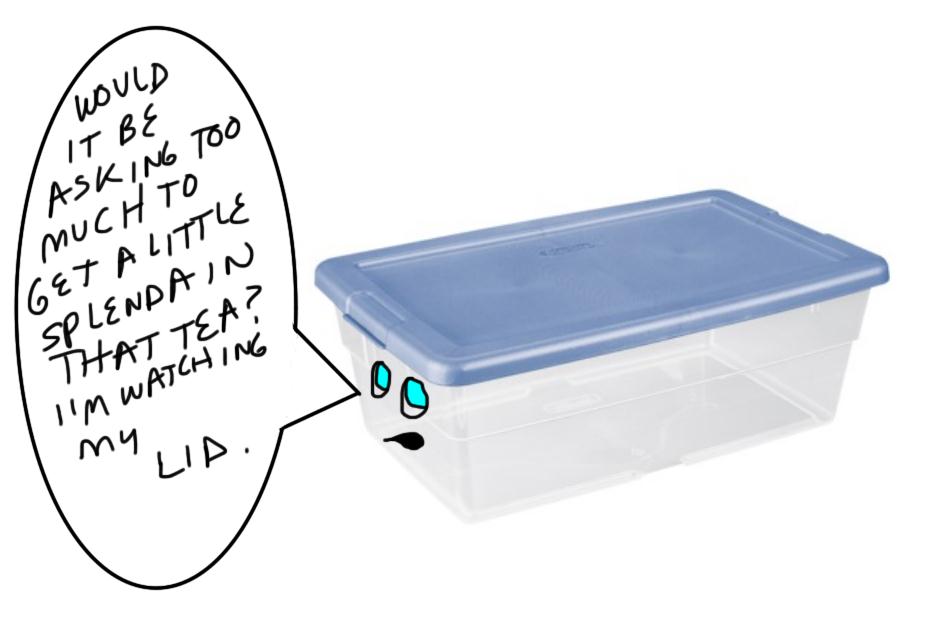 Bin: "Oh, doing well. A spider came by and cast a web on my left rear quadrant but then Megaroy came by and ate him. Can you do something about the way that cat's poop smells? It singed my lid. You can see where it isn't blue anymore."