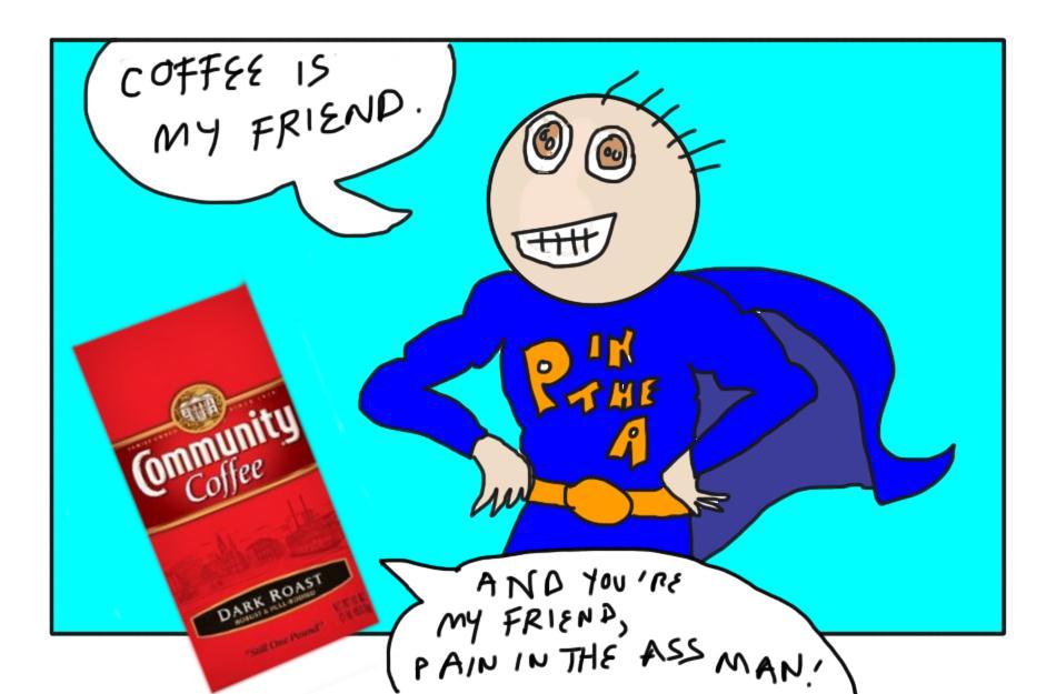 Back to Pain in the Ass Man. Recently on a search for coffee, he brought out a plastic bin that had been unpacked but not unloaded. It had the sealed bags of coffee for which he was searching. Community Coffee for those of you not inclined to drink of the coffee arabica, comes from Louisiana and has chicory in it. I don't drink coffee, but Pain in the Ass Man swears by it. Out came the Community Coffee to be put in a special locale of worship by the coffee pot. Hosannas were said repeatedly. There might have been sweet murmurings. ("You're the only coffee for me, baby." "Would I drink that shitty Maxwell House, sugar?" "Who's my little, widdle, middle baggie of coffee-poo?")