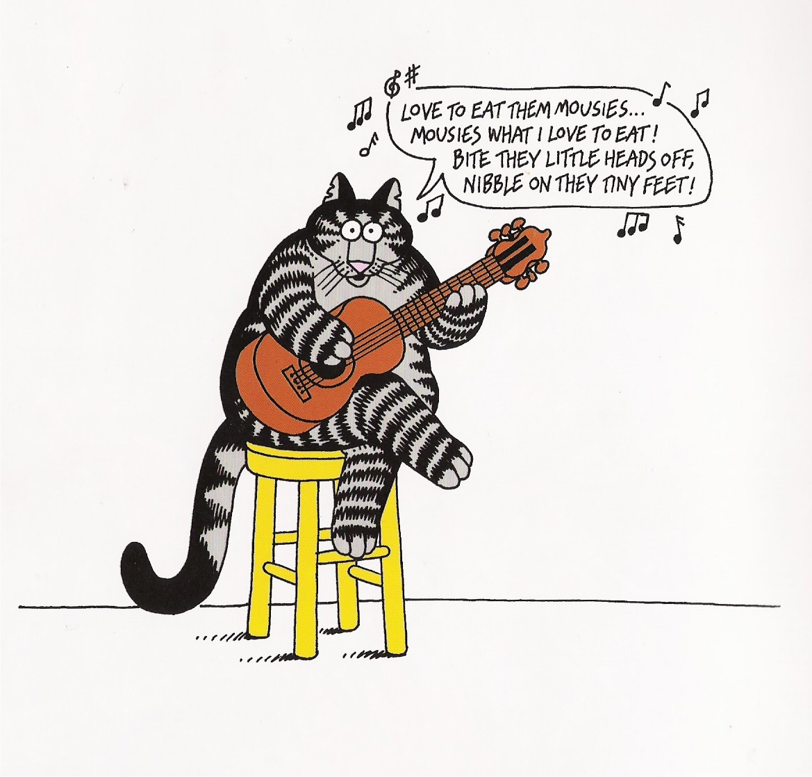 We went and got mouse traps plus peanut butter. They have a nice selection at Home Depot. So far we haven't caught any mousies. And I feel compelled to inject my very favorite Kliban cartoon. I wish Megaroy knew how to read and had a brain instead of dead space there so he could read this cartoon and gain inspiration from it. Too bad.
