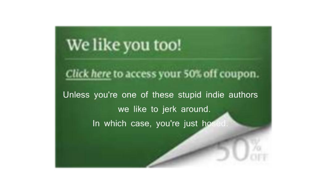 In the meantime, B&fuckingNoble (sorry for the language but I'm incredibly pissed at them now) has been sitting in an imaginary world where they don't have to deal with indie authors who publish with them through pubit! or smashwords. Apparently this is the world where they don't answer emails, they don't answer their phones, and they don't have voice mail. Apparently they also don't train their customer service staff to deal with the authors that they encourage so virulently to publish with them. I sold the majority of my work through B&fuckingNoble this year. Probably over 60,000 sales and I'm so angry I want to jerk all my books off, but I don't want to lose my customer base there. So I've concluded that B&fuckingNoble hates my guts and doesn't want to do business with me. It probably doesn't help that I posted their email on my blog and encouraged fans to feel free and email them. I don't know how many of you emailed publit@bn.com (whoops, did I do that?) but thank you for the support. (Thank you! No, THANK YOU! You really, really like me.) Maybe it will make a difference. I'm not sure what to do next in relation to this perplexing situation. I've written emails to the CEO and everyone else I can think of, and I've got nothing in response. The B&fuckingNoble community board has dozens of complaints along a similar line and they're still doing nothing. Clearly they're not interested in supporting the indie authors that they try so hard to bring in. Bet they like the paycheck but hey, why bother supporting the author?