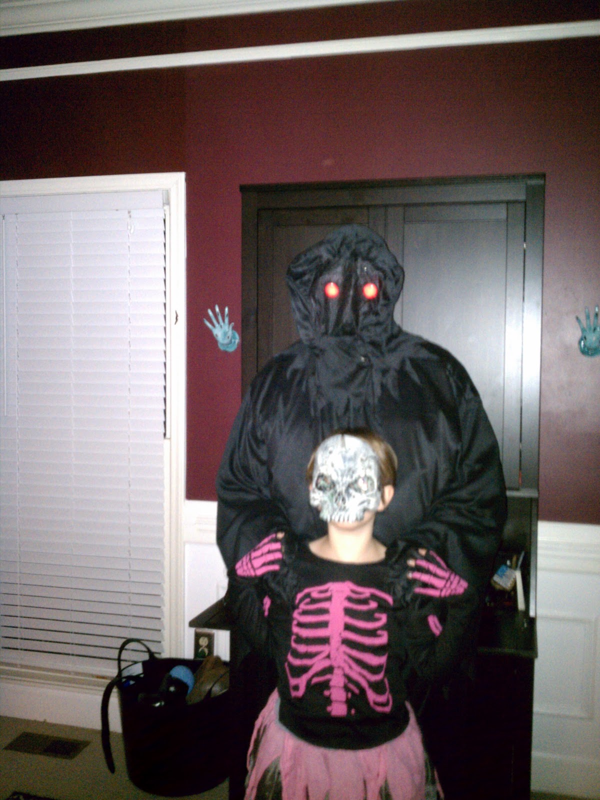 See. Our candy was so cool it talked.Upon HIM's return from taking our daughter trick or treating it was related the reason why no one was trick or treating in the loop. (HIM was riding the wave of gleefulness from having scared the crud out of a four year old, who undoubtedly is still having nightmares about the thing with the glowing eyes.)