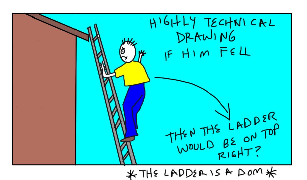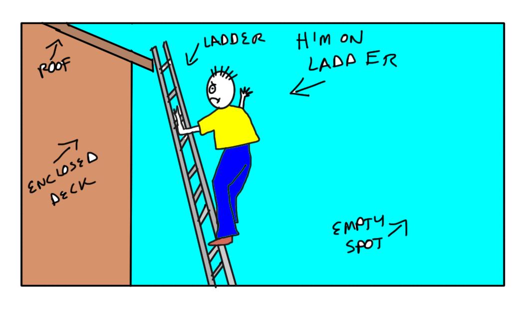 HIM fell off the ladder. (Why he was on the ladder was a whole different story.) Somehow HIM ended up falling off the ladder and then landing on the ladder. I should have stopped to take a picture but I wasn't thinking of posting it at the time. (Later I would regret it, but you know how these things go.) So here's a diagram for hilarity's sake.