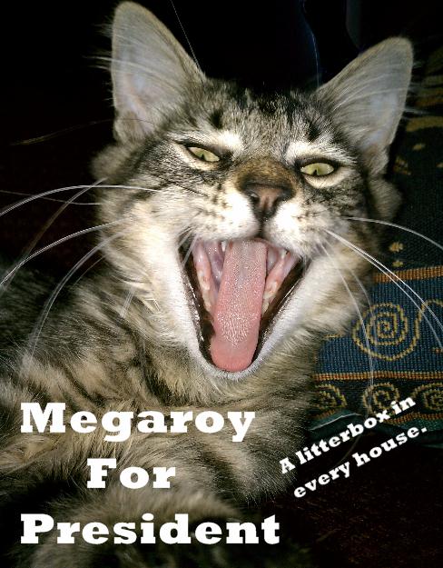 Megaroy is like cat no. 6 in our lives. I had managed to be cat free for a bit because I put my foot down while Cressy was an infant. But then Daddy started in with his secret agenda, and manipulated our daughter into massive treason on a feline basis. Ta-da. Megaroy.