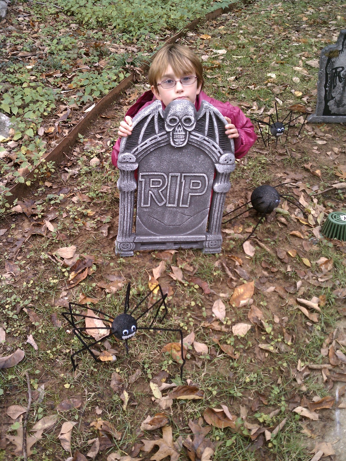 Look, we even had a kid to pop out and go "BOO!"I was severely disappointed by Halloween. I mean we put out gravestones. We put up 12 spiders with googly eyes. We did purple Halloween lights along the walkway. We had a fog machine. Come on. I had a boatload of candy. (The good kind, too. No generic crap. No bubble gum. Twix, Reeses Peanut Butter Cups, and Butterfingers were examples. We didn't have candy. None of that pussy candy from the Dollar Store. We had CANDY!)
