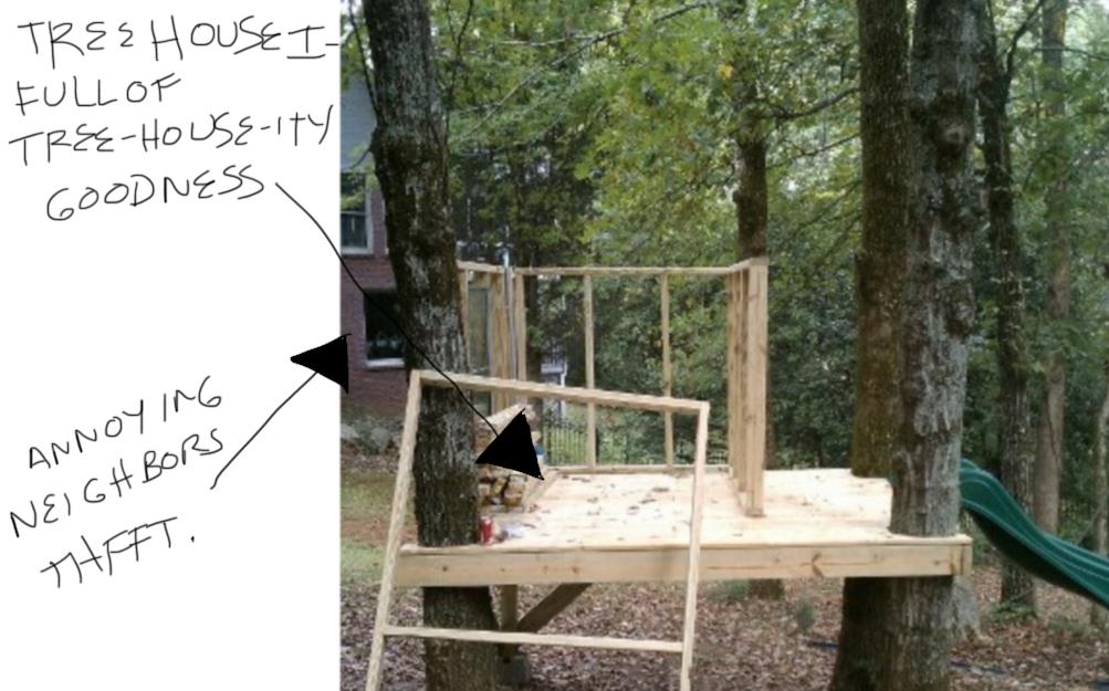This will be on the side of our house facing the neighbors.Pretty soon the neighbors will be wishing they had not complained about the tree house.