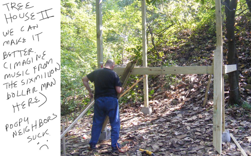 1. Tree House I was busted by unknown neighbors who squealed to the City of H'ville who sent a zoning department officer to say things to me. He wasn't mean. Tree House I was pulled down the next day. I glared intermittently at the neighbors and entreated them to kiss my tuckus.