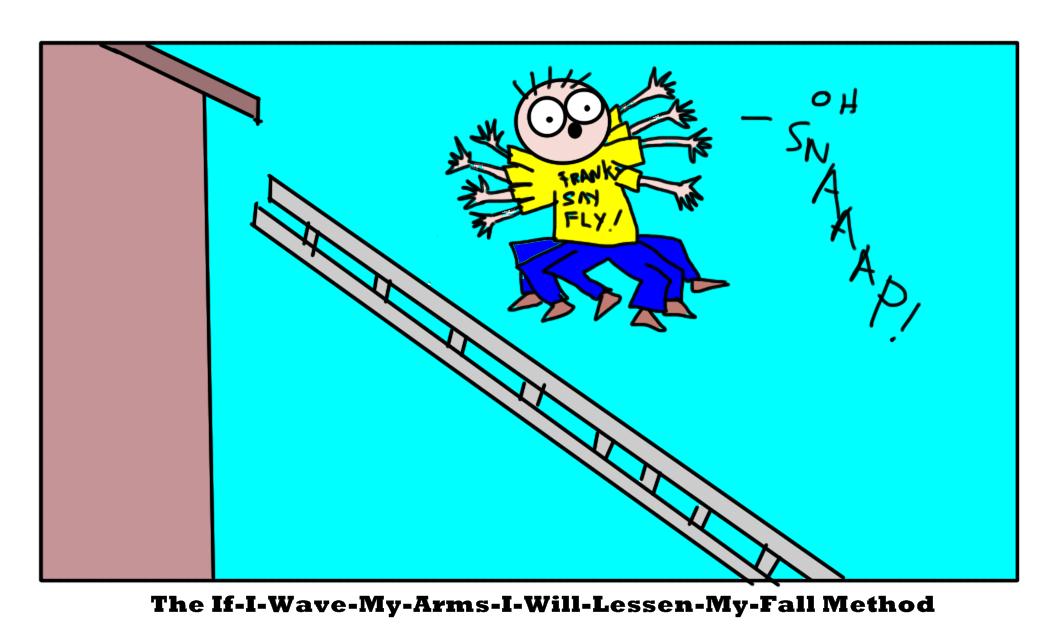 Unfortunately HIM could not fly. One can see from this picture that gravity is making a point. If one is up in the air, one will not hover like Wile E. Coyote and flap one's arms. (I secretly wanted the coyote to get the Road Runner at least once. And did anyone else think it was weird that Wile E. Coyote had all that money to buy stuff from Acme but he couldn't buy himself food?) (Just me, right?)