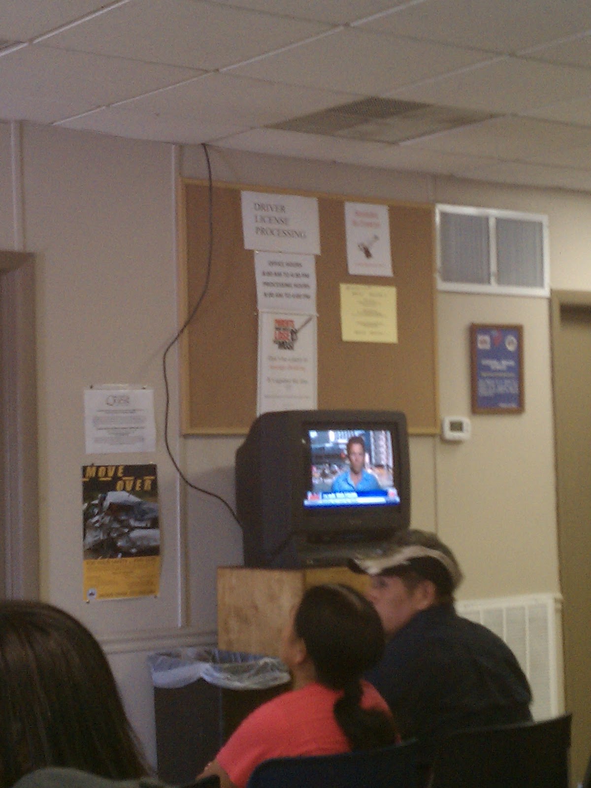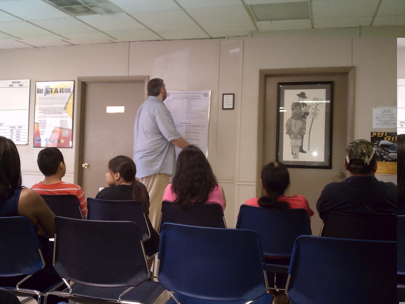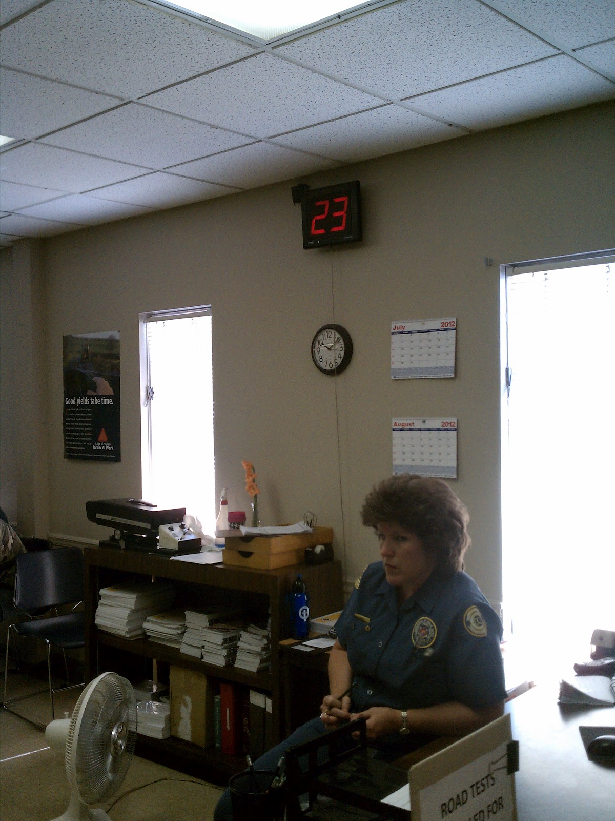 We got to go in after the 22 other people got to go in. (Those were all the people who didn't have sun stroke and third degree burns. I'm going to get sun block after I finish this blog.) So by the time I talked to the lady with the slipper and she examined my documents. (I had to show her my old driver's license, my social security card, my passport, a signed contract from Satan, and a form giving over my first born child to the state before I got my number.) I was number 24. That doesn't sound so bad, right? Hahahaha. (I'm doing a lot of laughing in this blog, but it really isn't funny haha laughing. It's if-I-don't-laugh-I'll-cry laughing.)