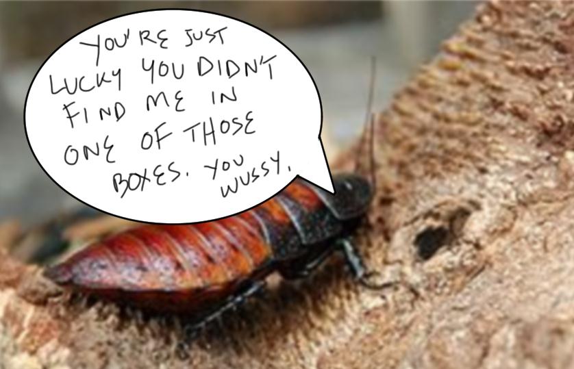 Here's my week. I pulled off shreds of wall paper from the dining room walls because it had the most horrendous poop brown pattern that man will ever see. (Or woman. Or child. Or Moron cat. Or Giant Madagascar Hissing Cockroaches, which I will get to later in the blog. Be patient.) Beneath the wall paper I discover MORE WALL PAPER. But this wall paper has been painted over with graveyard gray. (I'm not making this up. They had GRAY walls the color of Bruce Willis' undershirt at the end of Die Hard.) Normally this probably wouldn't bother me but they didn't do a good job on the corners and they look like Joan Rivers' face before Botax. (That would be a bad thing for the walls, not so much for Joan.) Not much I can do about the wrinkles except to break out the box cutters and a big sanding block. You might wonder why I'm doing home improvement instead of writing. (Well, I'm writing now, I'm blogging. Same thing. Kind of.) The formal dining room will be my Fortress of Solitude or my office of doom, into which no animals, children or HIMs shall intrude when I have my headphones on. (Hah! That'll work. Really.) So I need my office space and since the IRS is particular about home office rules (we don't need no stinking IRS rules) I have to have a dedicated space in the house. Hence, home improvement nonsense, which naturally translates into blogging galore. (I can't help it. It's kind of like a weird writing disease.)
