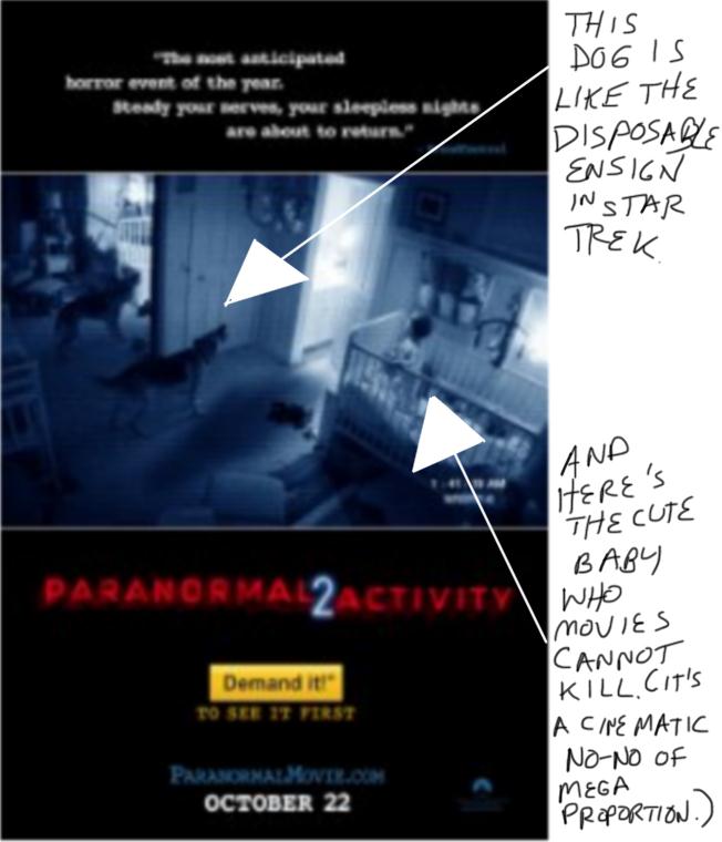 Why? Why, why, why, you ask. I was wondering where their plot could go considering that PARANORMAL ACTIVITY 2 is a prequel to PARANORMAL ACTIVITY 1. (I added the number for clarity.) (Also you ask why must I italicize the movie title and put it in caps AND make it red? Because it amuses me. Also I think there's a rule about movie titles being italicized. Then I just made up a rule about all supernatural related theme movies being in RED. I would have it dripping in RED but I don't feel like doing that many illustrations.) Where was I?