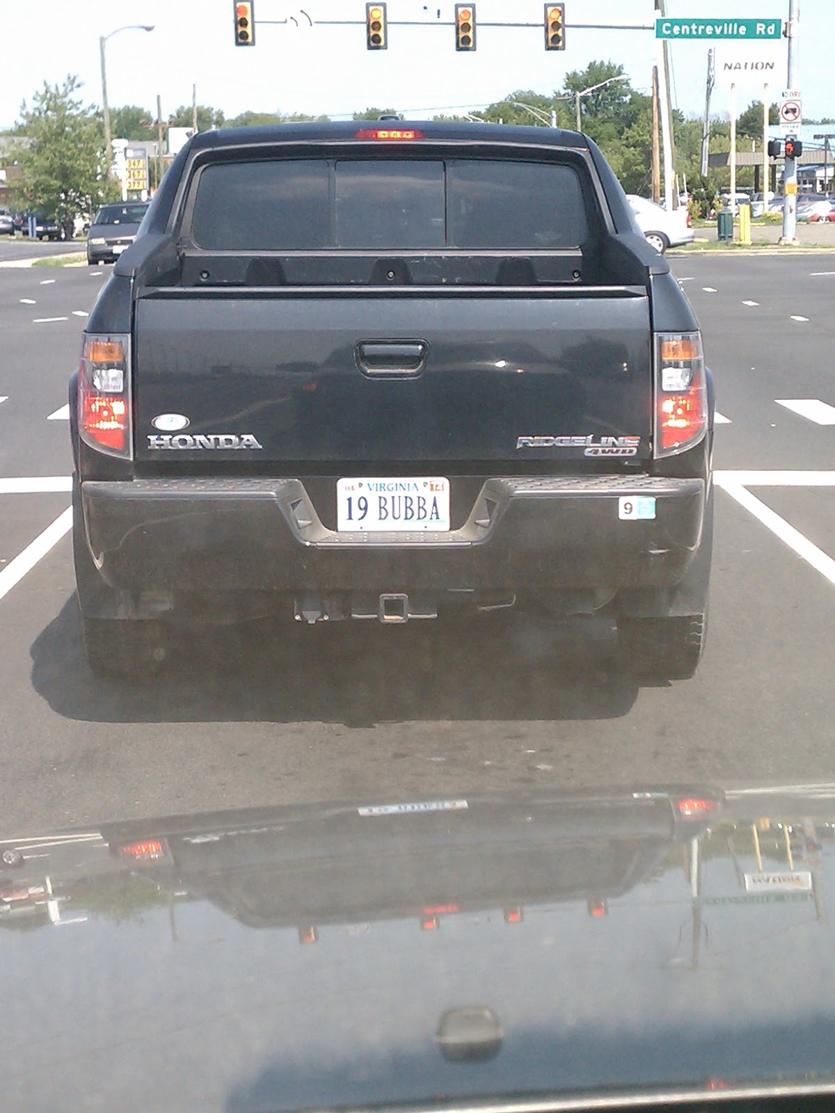 You ain't nothing but a bubba, crying all the time.Who knew they have bubbas in Virginia, much less at least 19 of them who want vanity plates? But look, this Bubba drives a Honda truck. (It's like a pretend truck. He might as well be driving the Barbie Beetle.) He should be ashamed of himself, not driving American. Plus, he forgot to use his turn signal at this light.
