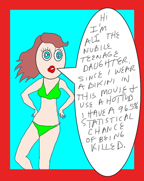 Of course, paranormal adventures are about to ensue! We've got things happening. A burning pan in the kitchen that no one owns up to. Mysterious thumps in the night. The pool cleaner climbs out of the pool by itself. (I think the entity had something against a clean pool.) The nubile step-daughter has a boyfriend over, who may also be a would-be VICTIM! In fact, I'm pretty sure his t-shirt said, "Kill me, I'm a horny teenager." on it. (Hey, they were in the hot tub together at one point in time and that's like an automatic, thou-shall-die-wretchedly-if-you-do-this rule they just broke.)