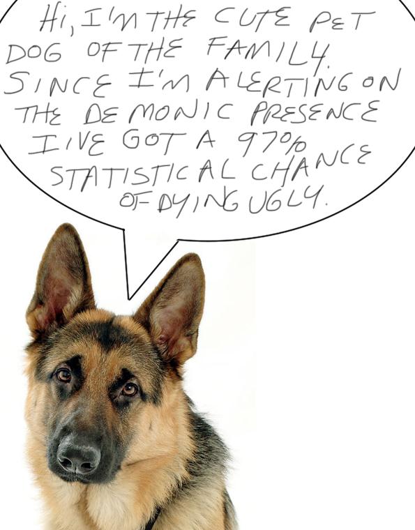 And most importantly, the cinematic viewer gets a whole crop of would-be victims to choose from. We have the nubile step-daughter, Ali, who luvs her brother, but also luvs to think about various theories on why demons choose to hang at their house. (In fact, it is she who determines that some ancestor made a deal with the devil in exchange for a first born son, and there wasn't any sons until Hunter. Her theory was a little weak and lacked evidence but it's a horror movie, so we're stuck with it.) We have a nanny, Martine, who warns all of the family in Spanish, because if she had spoken English it would have been a really short movie. We have the dad, Daniel, who basically pooh-pooh's every one's supernatural suspicions. ("No, people, there is nothing going on. It's an electrical confluence of metaenergy. Or swamp gas.") We have Kristi, who looks like she's having post-post-post partum depression and really isn't happy about anything. We have Hunter, the cute little baby who talks to the nonseen entity just off camera. (Hunter was having a good time. I suspect his real mommy was waving Cheerios at him.) And we have a dog. A German Shepherd named Abby, who is a big, fat, flaming target walking around woofing and eating doggy biscuits. (You know that everyone in the audience is going, "Poor damn dog.")