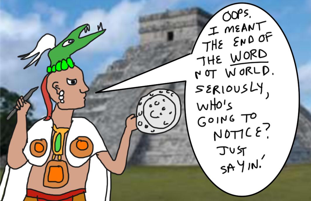 Oh NO! No OR in the title! What does it mean? Is the world coming to an end? Were the Mayans right or were they really mathematical whackjobs who happened to leave a stone carved tablet lying around that some nerdy archaeologist misinterpreted. Or was it more sinister?