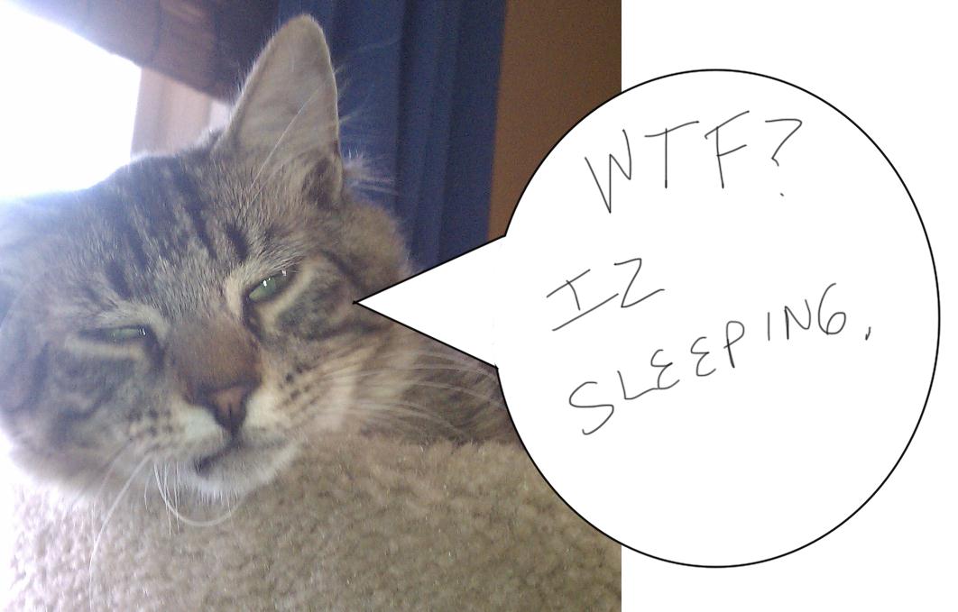 No, Cressy the Vampire had a new victim. Megaroy, her moron cat, was sleeping on top of his kitty condo, resting from the aftereffects of too much catnip, when suddenly, Cressy the Vampire crept toward him. I mean, I think he noticed her but he's used to her creeping toward him. Neither was he impressed by the glow-in-the-dark vampire teeth. (Cressy the Vampire had to pause mid-creep because the glow-in-the-dark vampire teeth were making her drool down the side of her face. So she wiped with her sleeve. Do we do manners in this house? Oh, yes, she could have just spit, like most vampires do.)