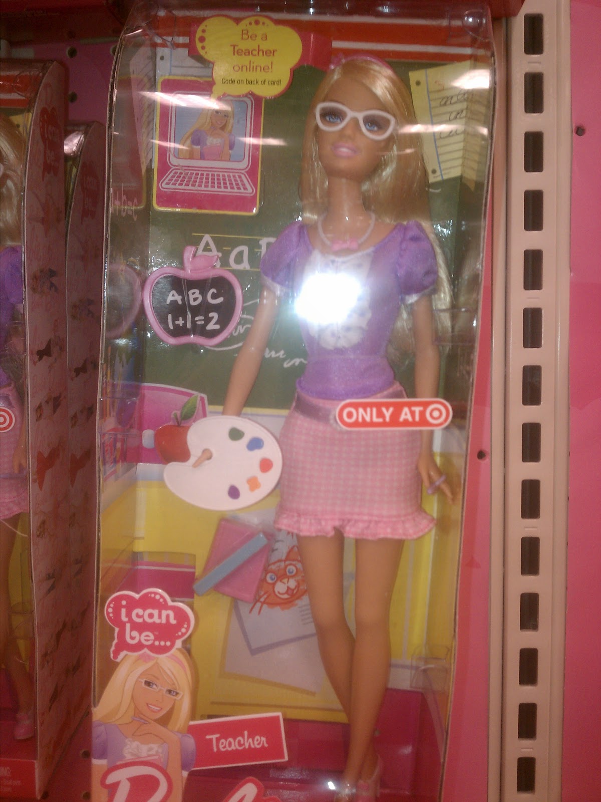 Next up, there's Barbie as a teacher. Typically I wouldn't say anything. (I wouldn't!) But this one ticked me off because of the glasses. You know only people with glasses are smart enough to educate our children. Really? REALLY, Mattel, you should slap your own hand.