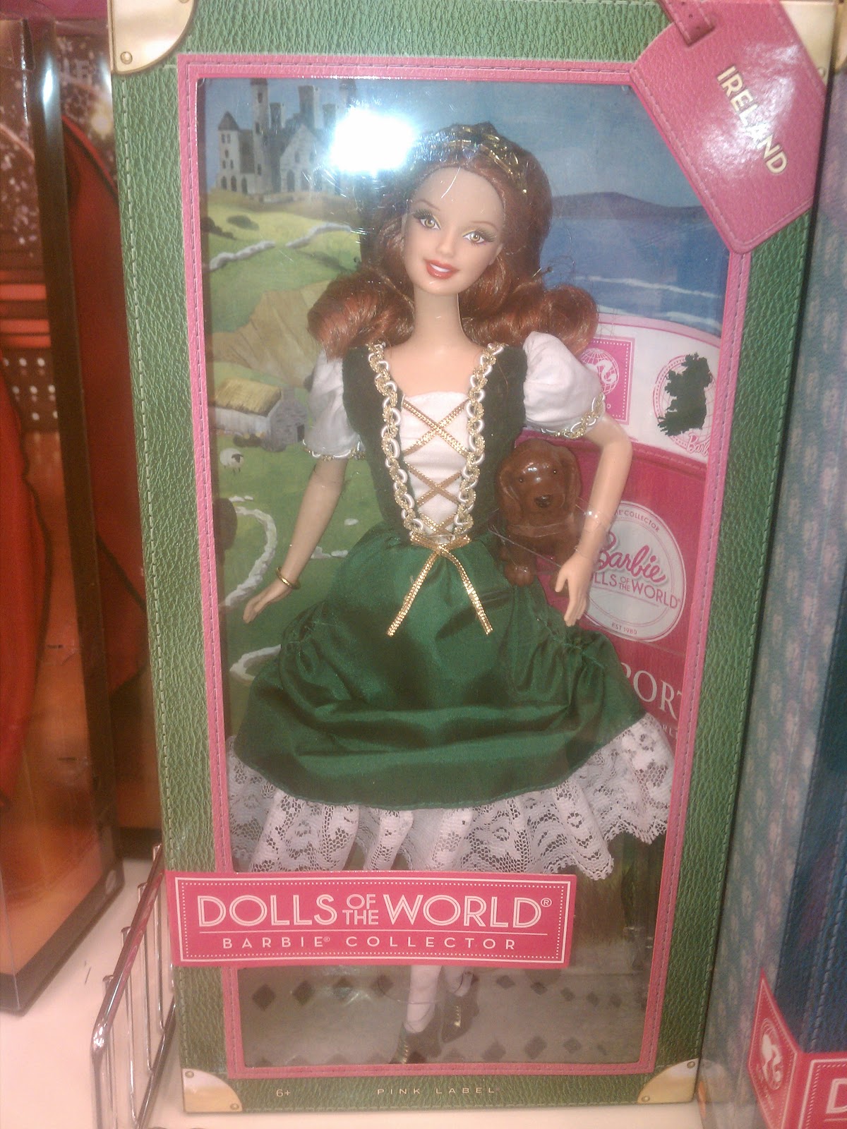Then there was this one in the special Barbie section. (It's very, very special!) At first I thought they were going for lederhosen Barbie or Lost in the Alps Barbie. All she needs is cheese and sheep. Also one of those big horns so she can call, "RIIIIICOOOOLAAAA!" But I looked closer and saw that it was really Irish Barbie. (Did they go to Ireland? Did they check with the Irish? I don't think so.) I think Mattel missed the mark: