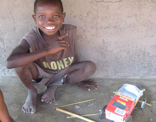 Why do I continue to torture myself, you ask. Well, we only have the one kid and she's got us wrapped around her little pinky finger, so basically we're hosed. I tried telling her, "You've got a million toys already." She says, "I'm just shopping." I don't know where she got the shopping gene from. It's not from my side of the family. I hate shopping. I think I know what happened. I have a friend, Violet, who luvs to shop. She LUVS to shop. She could shop for a job. Her job should be shopping. If there was a job just for a person who luvs to shop, it would be Violet's. Eight hours straight and she would be hap-hap-happy! One time she convinced me to go with her and OMG, the woman shopped for hours and hours. I thought she would have to call an ambulance for me. (She promised food at the end of the shopping experience.) So what's my point. I'm getting to it. Here's what happened. Violet's shopping rubbed off on me. I don't have it, but I became a carrier, like Typhoid Mary. I give it to people. Like my daughter. Poor little girl.I tried to tell Cressy that there are little kids in Africa who have to make their own toys from rusting wire and stones, but she looked at me as if I had lost my mind. (This reminds me of my mother telling me to clean my plate because of starving children in China. That really worked, too. Not.) I found a picture of a child who made a car out of a milk carton to show her. She was not impressed.