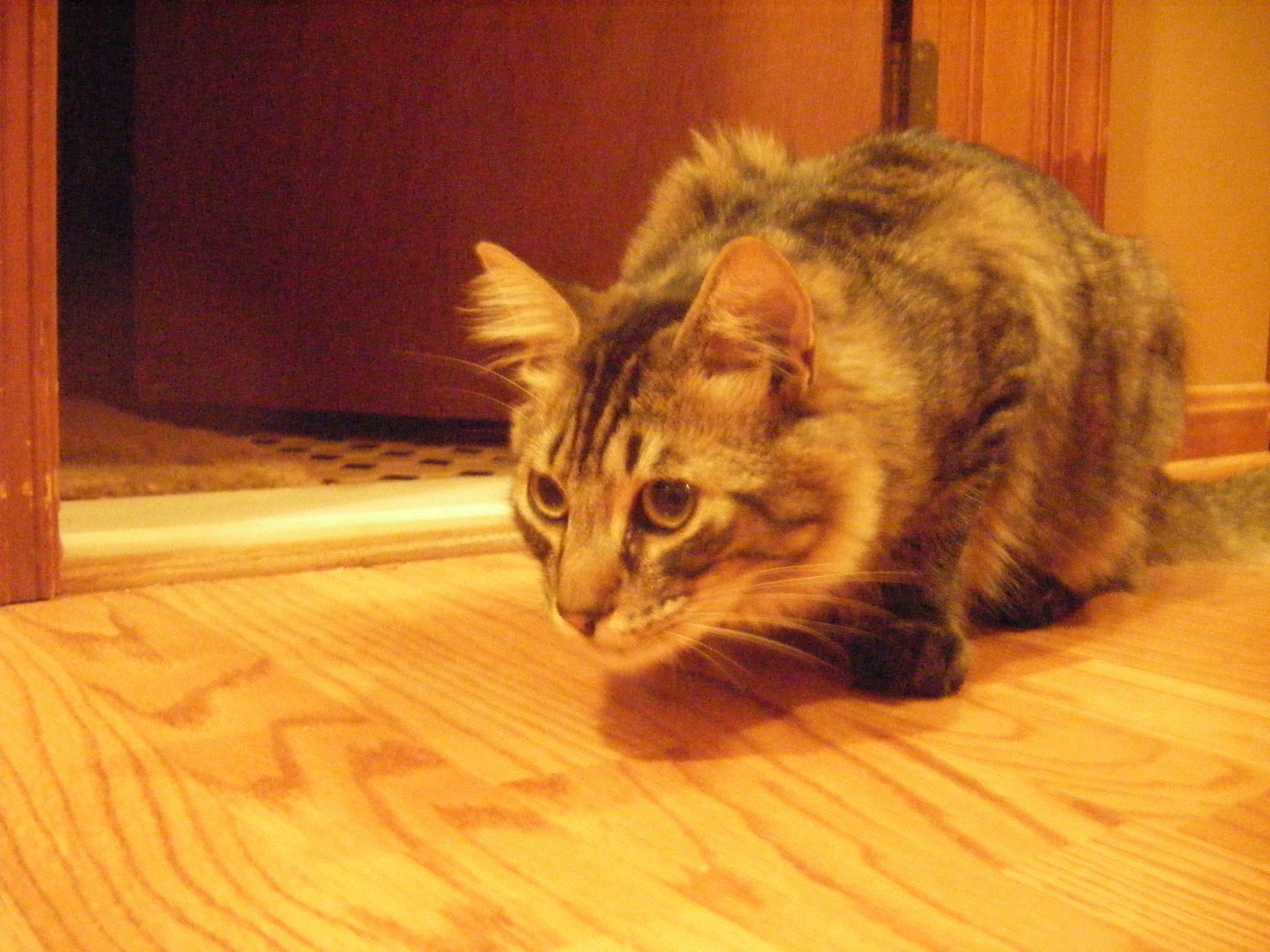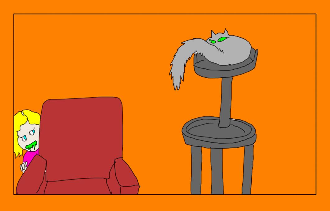 Slowly, Cressy the Vampire approached her prey. She got up next to him and took his large, gray fuzzy tail in both hands and prepared to bite him in order to suck all his moron blood out. (Not sure if the cat would actually act any different without moron blood in him. Possibly he would become smarter.)