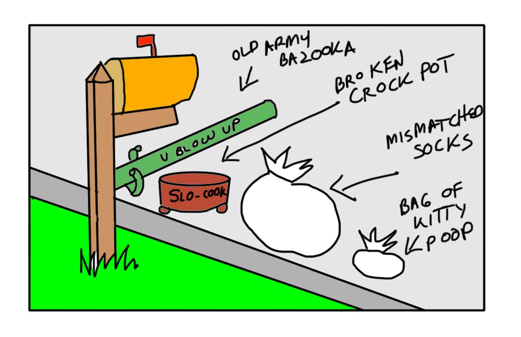 Actual garbage left out by moi. Except the bazooka. That was made-up.After the event. See the items have VANISHED! It's a mystery. I did not see anyone take them. I did not hear anyone take them. Although I did hear the neighbor yelling at her daughter about 11 PM about how everyone could hear everything they did anyway. (I swear I wasn't listening to them on purpose. They were yelling loud enough for the next town over to hear.)