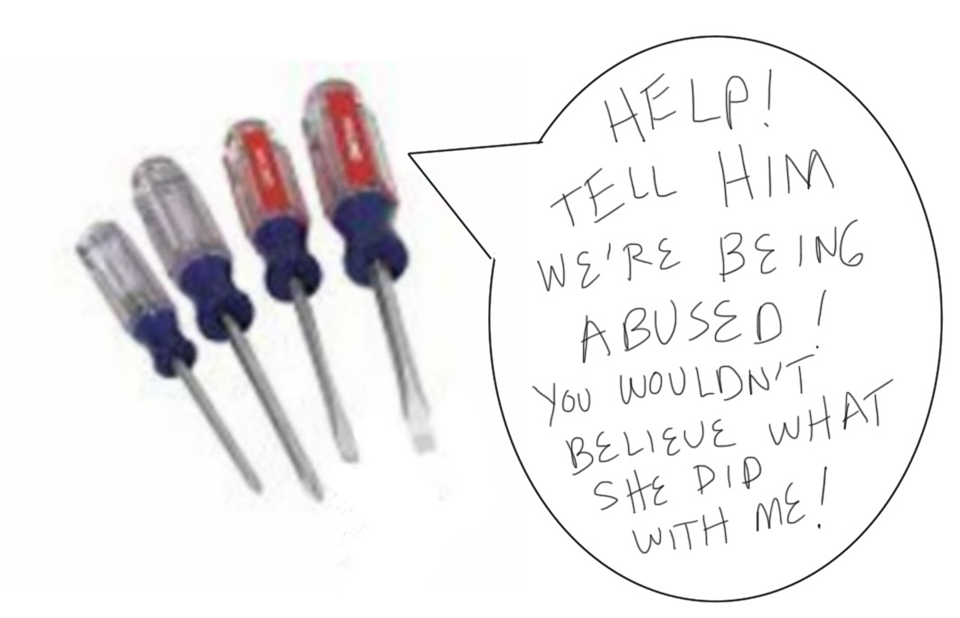 HOWEVER, the tool chest is blocked by the lawnmower, the 1954 Chevy Rust-O-Shit/combination-storage-device Truck, boxes of crap that have been moldering in the attic since the last time we moved, and piles of "outdoor" toys for my daughter. Let's just say that if my back hadn't been hurting already the lawnmower would have been thrown a block away. In fact, once I had negotiated the maze-o-doom, I did not go back to the garage to find one of those paint-stirring sticks because I said several four-lettered words instead. I used one of HIM's Craftsmen screwdrivers as a stirrer, as well as a can-opener. I wiped it off because I didn't want HIM to know. (Toilet paper doesn't wipe paint off very well and I don't recommend that you flush toilet paper inundated with wall paint in your potty. DON'T DO IT!) Anyway, I finally finished that part and painted over the holes in the walls. (Told ya number 2 was long.)