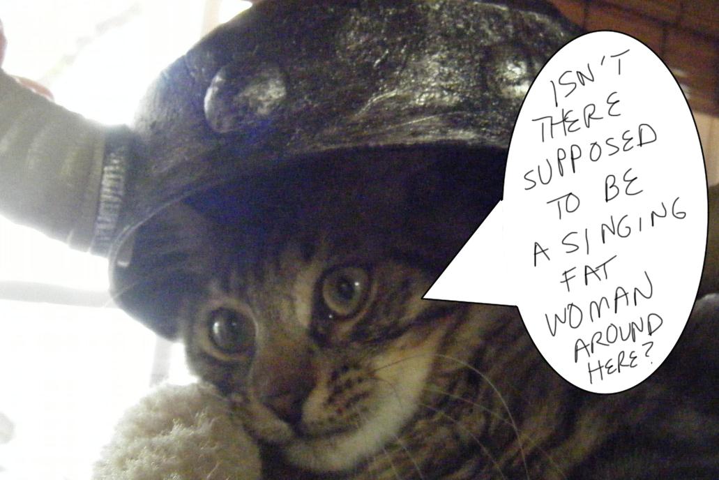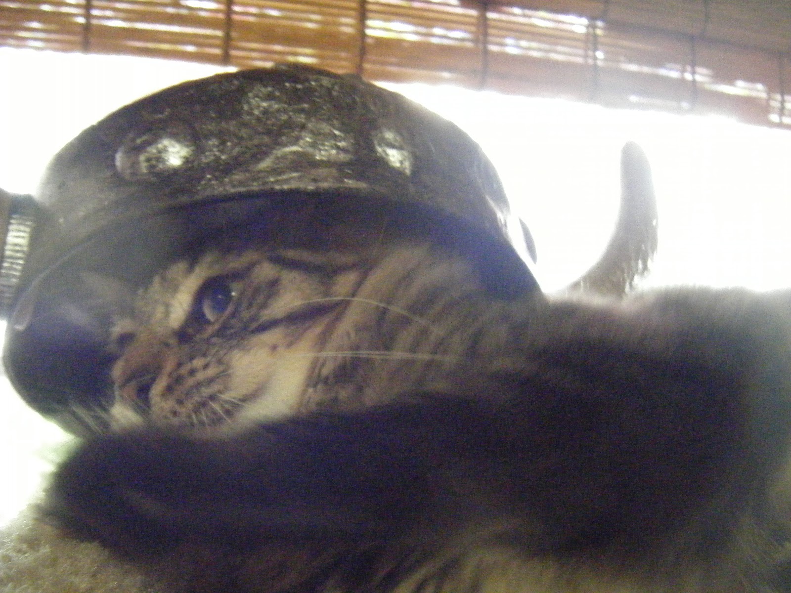 Megaroy with a viking helmet, showing his GRR face. Being close to the mid-century mark, I have had pets over the years, cats, dogs, fish, parakeets, and possibly some invisible ones. Also some things I would call pets. (Boyfriends, odd friends, and people who you don't know how to characterize any other way. This is a joke for those of you who still think I'm being mean to the moron cat.) My point is that I've had many pets and comparitively speaking, Megaroy is the dumbest one to date.Basically, I know cats, I've served with cats, and cats have been my friends, and you sir, are no cat. (Was that scoring off Lloyd Bentsen or Dan Quayle? Who cares?) (I once saw Dan Quayle at Fort Bliss, Texas during the first Gulf War. He was running with a battalion of tankers, which would have been okee-dokee, except the tankers had all been forced to wear "Scudbusters" t-shirts. I'll explain. Scud busting was done by Air Defense Artillery and was infamous at the time. HIM was a Scudbuster. But these poor bastards had to run with the idiot vice-president, although he didn't accidentally shoot anyone with a shotgun, wearing a t-shirt that didn't even promote their core job skill. Embarrassing! Hey, idiot vice-president, moron cat, they should get together. I wonder if Dan Quayle would like the moron cat as his close personal pet buddy?)