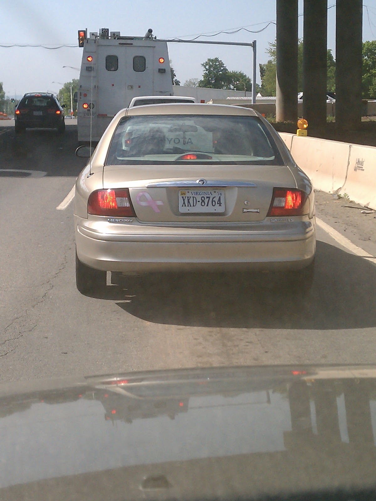 Yes, this is a tan Avalon with the VA plate of XKD-8764,in case anyone has trouble seeing it.Why? Because she went through an entire school zone doing at least 45 MPH! Then she got to this stop light and had to wait two minutes anyway like the stupid, unthinking person she is. And look at the back of her car because there is an interesting dichotomy there. She supports finding a cure for breast cancer (yea boobies!), but screw all the little kids walking home from the elementary school because she has to go fast through the school zone (boo, little children!). Shame on you, unknown woman driver from Manassas, VA. I hope someone you know sees this blog and points it out to you. Your driving sucks and you're going to hurt someone. (Probably not pink clad boobies, but possibly small children trying to cross the road because it's the only way home and you're driving down it, without thinking.)