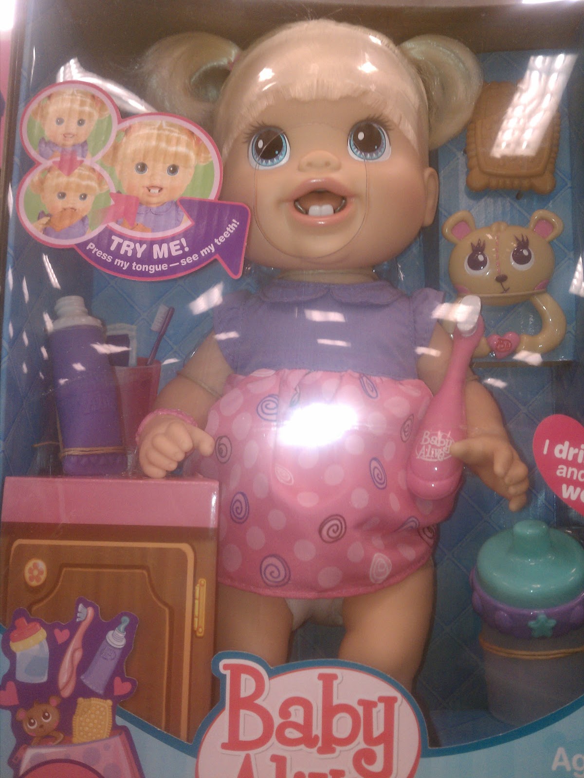 Then there was, what the hell is it? Creepy little Baby Alive, as compared to what? Baby Dead? (The brand name is Baby Alive. I did not make this up.) The expression on this doll freaked me out. I thought she was going crawl out of the package and start chewing on some part of my anatomy, and not in a good way. Furthermore, they want passerbys to reach in and touch that mouth. (See it says so on the box, "TRY ME!" just in case you missed the creepy little open mouth and the creepy little buck teeth that are ready to chomp down on you, dumbass.) Like ewwy: