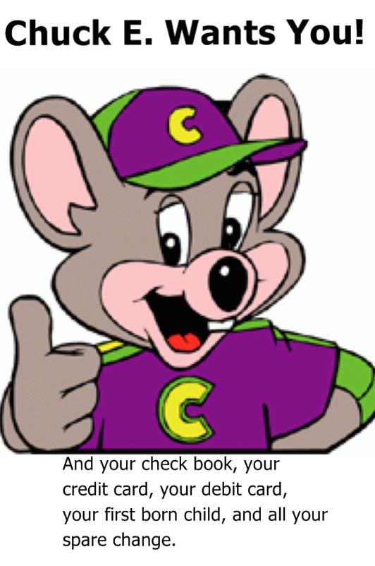 Anyway, the school had a fund raiser. Go to Chuck E.'s, spend your cash, and Chuck E. will give some percentage back to the school. (Generosity abounds, I wrote sarcastically. I think I'd rather just write the check to the school, but NO-OOOO, the school makes sure that our offspring knows all about the Chuck E. Cheese event ahead of time and even provides stickers to slap on their shirts to help them remember to prompt us. I was at the school one afternoon when they riled up the children five minutes before dismissal about their academic carnival and it was an ugly event. "Don't forget to tell your parents! Oh, yes, don't forget to tell your parents! And also, don't forget to tell your parents! You're a poo-poo head if you don't tell your parents! Your parents are poo-poo heads if they don't bring you!" I'm telling you, fund raising in schools has descended into the ninth level of hell.)